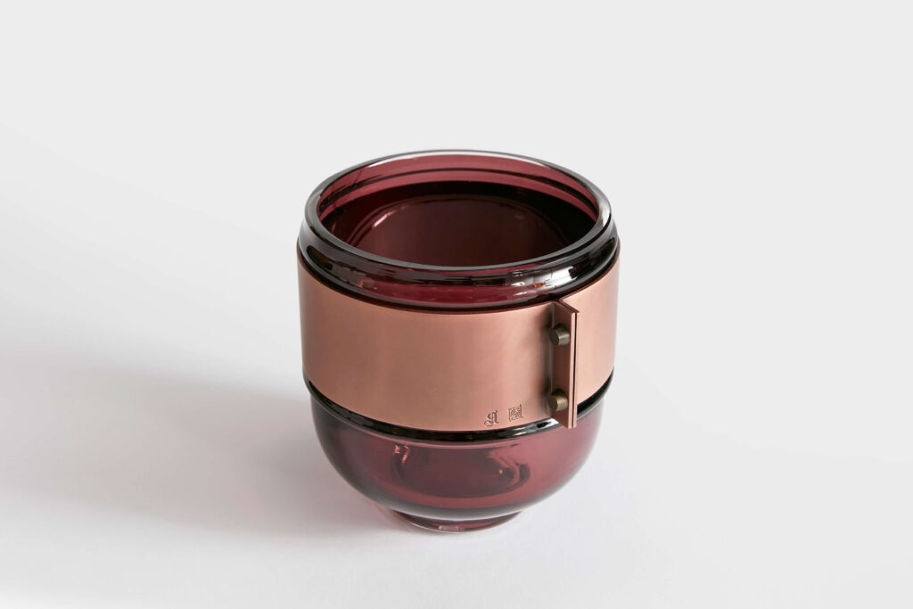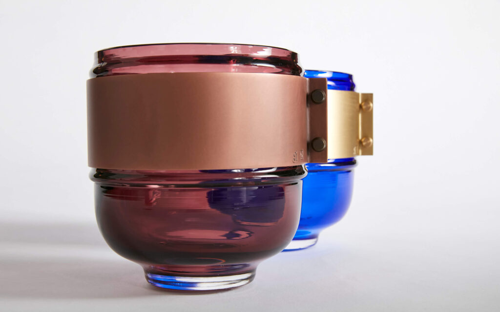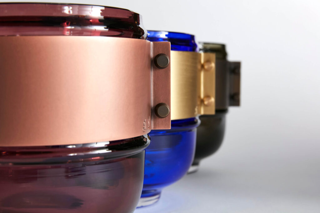 Chaque Athanor est une pièce unique soufflée à la bouche par un maître verrier et sertie d’un bracelet en laiton, cuivre ou bronze travaillé par le ferronnier d’art Pouenat.
