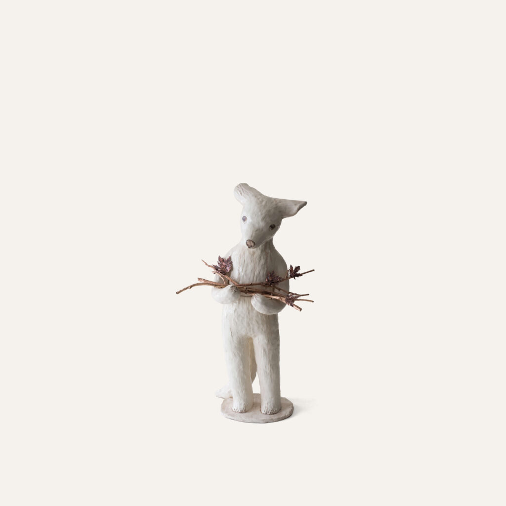 Sculpture intitulée « Grand renard aux branches», faïence émaillée, bronze et cuivre.