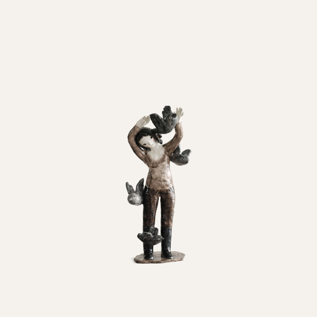 Sculpture intitulée « Jeune fille aux corbeaux », faïence émaillée. Pièce unique.