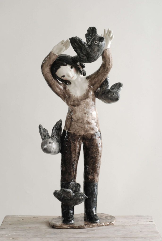 Sculpture intitulée « Jeune fille aux corbeaux », faïence émaillée. Pièce unique.
