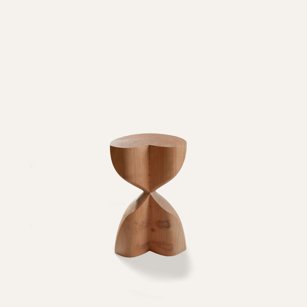C’est au pied des Pyrénées, au cœur d’un paysage de bois et de forêt que Romain Paris Garnault installe son atelier en 2022. Il y sculpte des meubles et des objets uniques façonnés en taille directe dans des sections de tronc d’arbres , cherchant avant tout à créer des sculptures à vivre, entre artisanat, art et design, magnifiant en toute sensualité la nature même de la matière. Les bois utilisés sont la plupart du temps des bois locaux récupérés et choisis avec soin et éthique, ils sont issus d’élagage. Romain est autodidacte, son processus créatif est intuitif et laisse toute sa place à la sérendipité. L’objet se dessine au fur et à mesure, en compromis entre les fissures et les nœuds qui animent le bois, la fonctionnalité et la volonté de sublimer le motif de veinage unique à chaque tronc, donnant ainsi à voir la « beauté intérieure » d’un arbre dans toute son individualité.