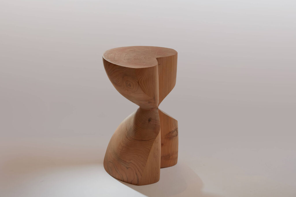 C’est au pied des Pyrénées, au cœur d’un paysage de bois et de forêt que Romain Paris Garnault installe son atelier en 2022. Il y sculpte des meubles et des objets uniques façonnés en taille directe dans des sections de tronc d’arbres , cherchant avant tout à créer des sculptures à vivre, entre artisanat, art et design, magnifiant en toute sensualité la nature même de la matière. Les bois utilisés sont la plupart du temps des bois locaux récupérés et choisis avec soin et éthique, ils sont issus d’élagage. Romain est autodidacte, son processus créatif est intuitif et laisse toute sa place à la sérendipité. L’objet se dessine au fur et à mesure, en compromis entre les fissures et les nœuds qui animent le bois, la fonctionnalité et la volonté de sublimer le motif de veinage unique à chaque tronc, donnant ainsi à voir la « beauté intérieure » d’un arbre dans toute son individualité.