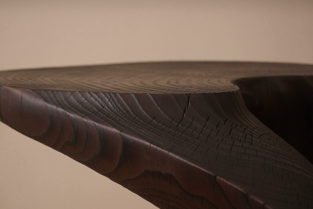 Guéridon sculpté, en cèdre brûlé. Pièce unique.