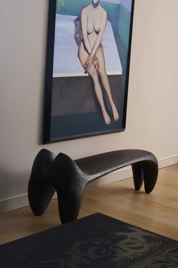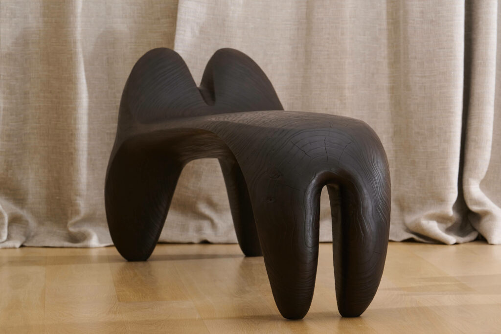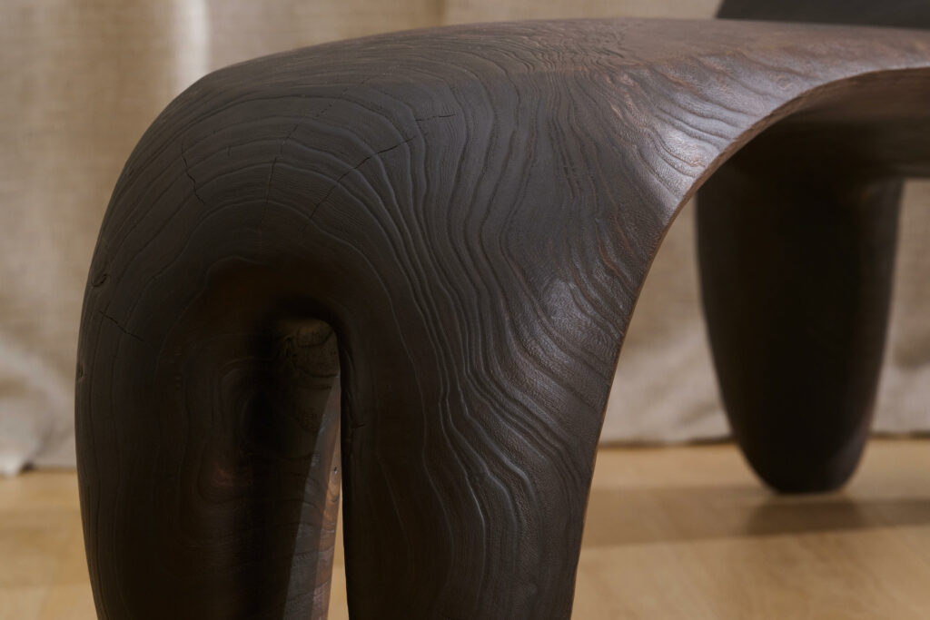 Banc sculpté en peuplier brûlé. pièce unique.