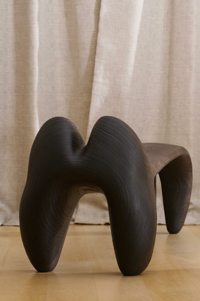 C’est au pied des Pyrénées, au cœur d’un paysage de bois et de forêt que Romain Paris Garnault installe son atelier en 2022. Il y sculpte des meubles et des objets uniques façonnés en taille directe dans des sections de tronc d’arbres , cherchant avant tout à créer des sculptures à vivre, entre artisanat, art et design, magnifiant en toute sensualité la nature même de la matière. Les bois utilisés sont la plupart du temps des bois locaux récupérés et choisis avec soin et éthique, ils sont issus d’élagage. Romain est autodidacte, son processus créatif est intuitif et laisse toute sa place à la sérendipité. L’objet se dessine au fur et à mesure, en compromis entre les fissures et les nœuds qui animent le bois, la fonctionnalité et la volonté de sublimer le motif de veinage unique à chaque tronc, donnant ainsi à voir la « beauté intérieure » d’un arbre dans toute son individualité.