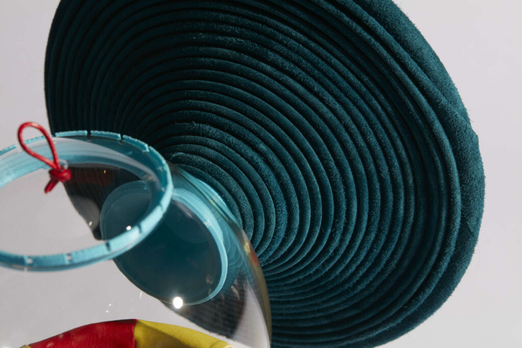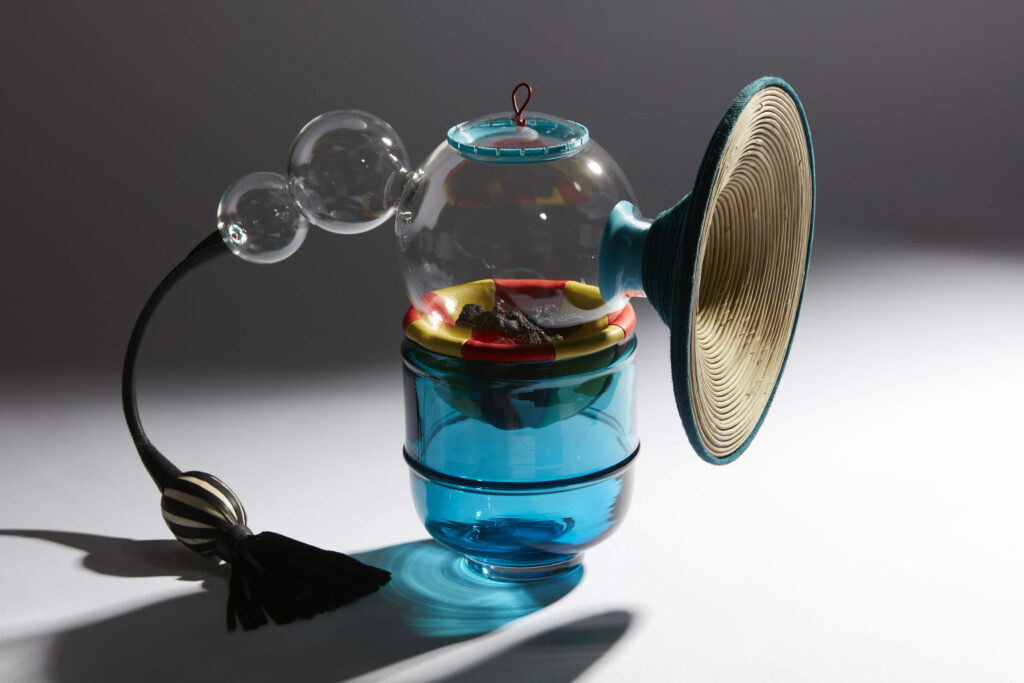 Verre soufflé, cuir et pierres de lave.