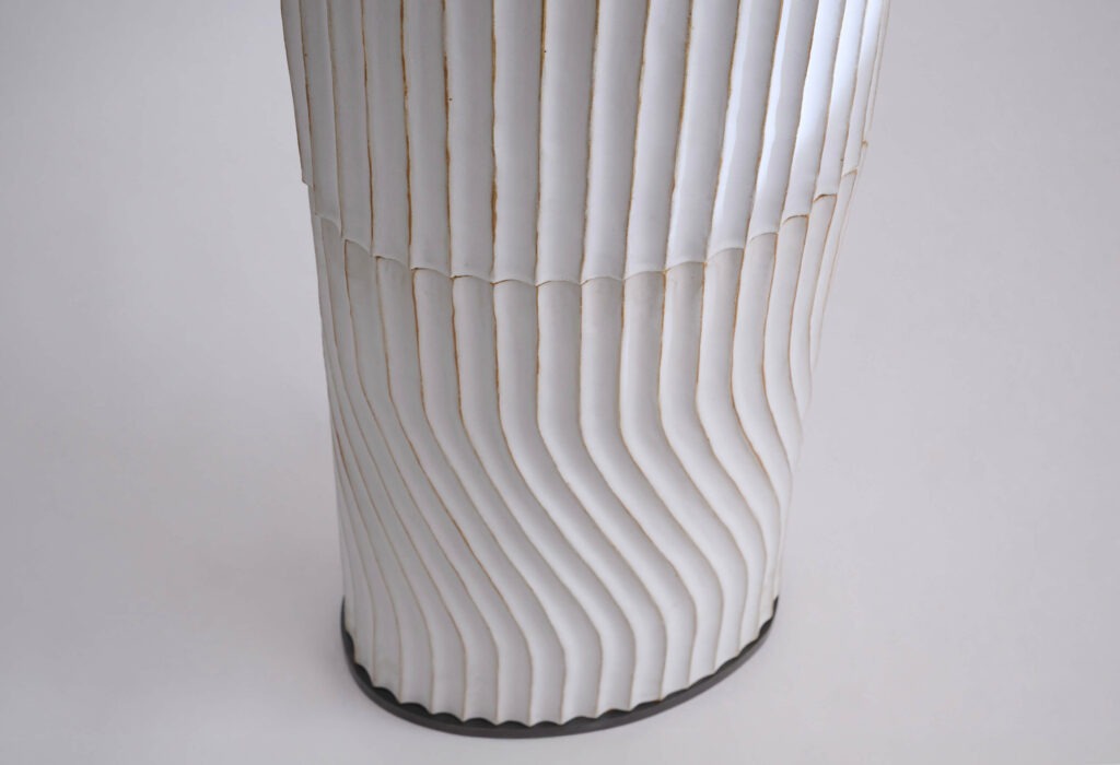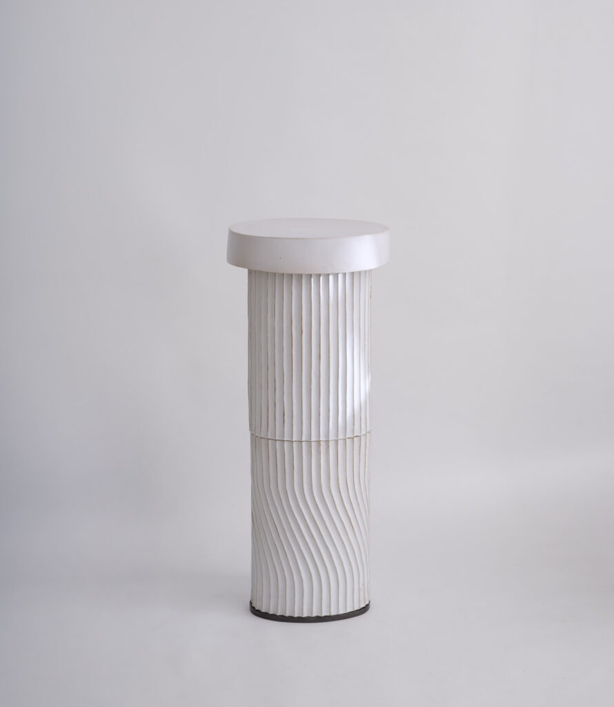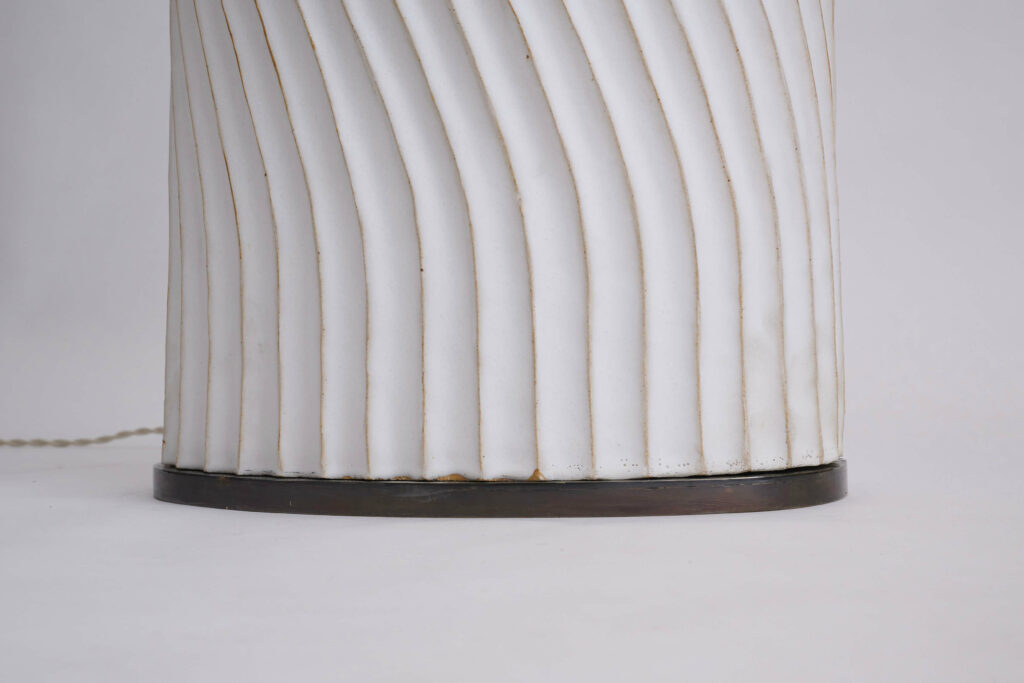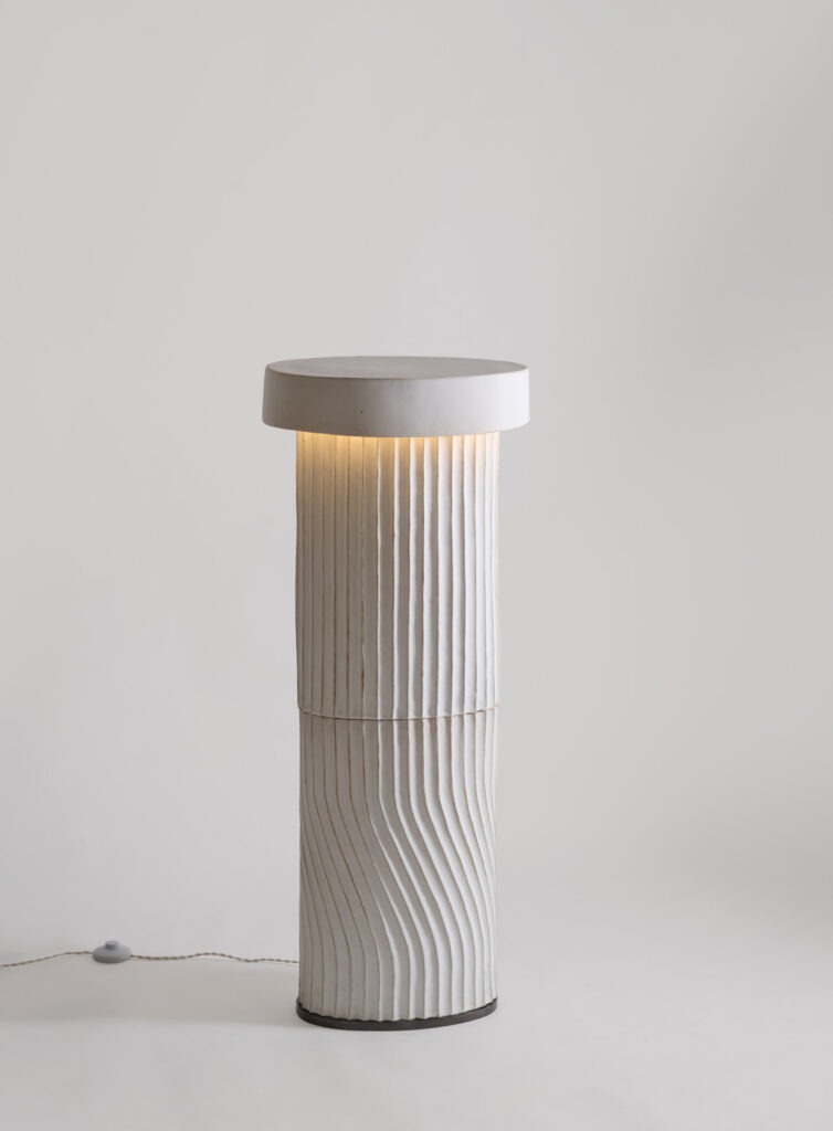 Le fût composé de deux cylindres décorés de cannelures, en grès émaillé blanc cassé, est coiffé d’un chapeau à rebords larges abritant la source de lumière (LED).