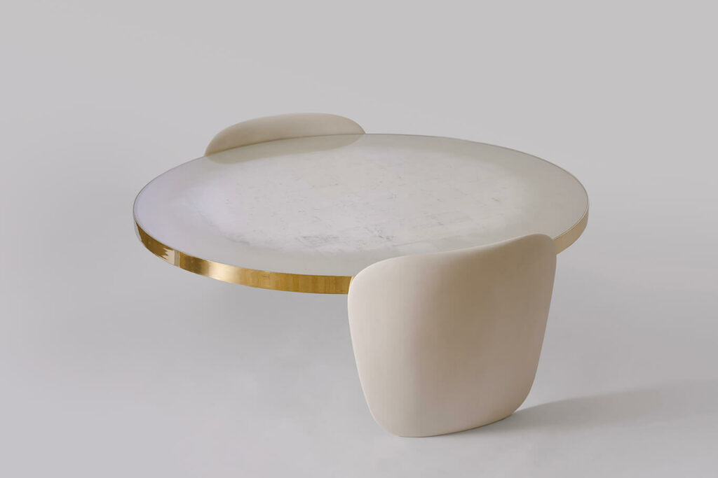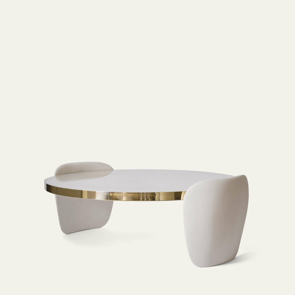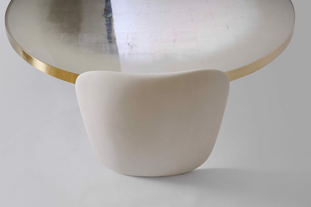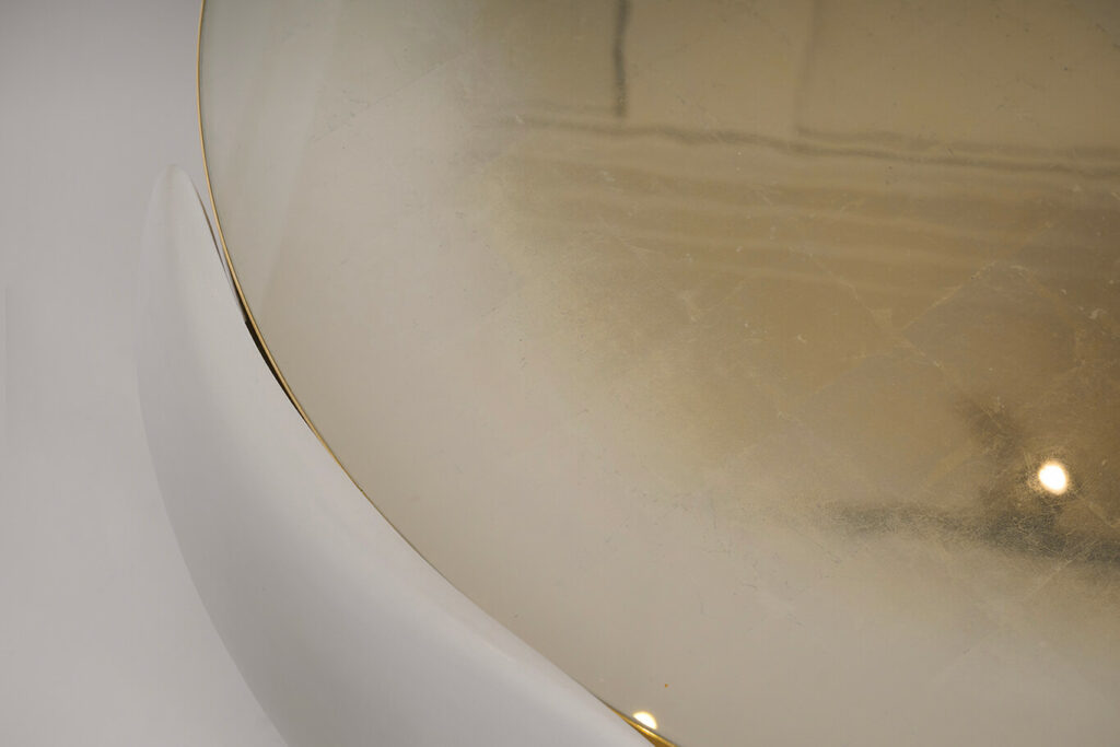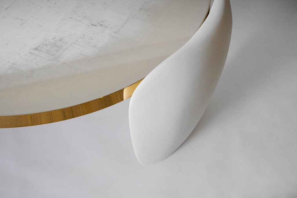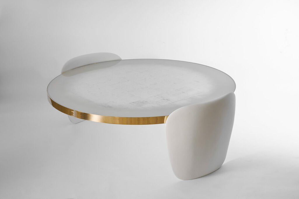 Table basse circulaire, les montants en plâtre peint, le plateau en verre décoré main à la feuille d’or blanc, cerclage en laiton.