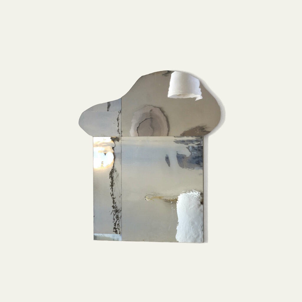 A mirror made up of several blue glasses, stretched or mouth-blown. Wooden back, edges finished with tin powder.