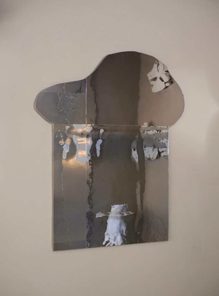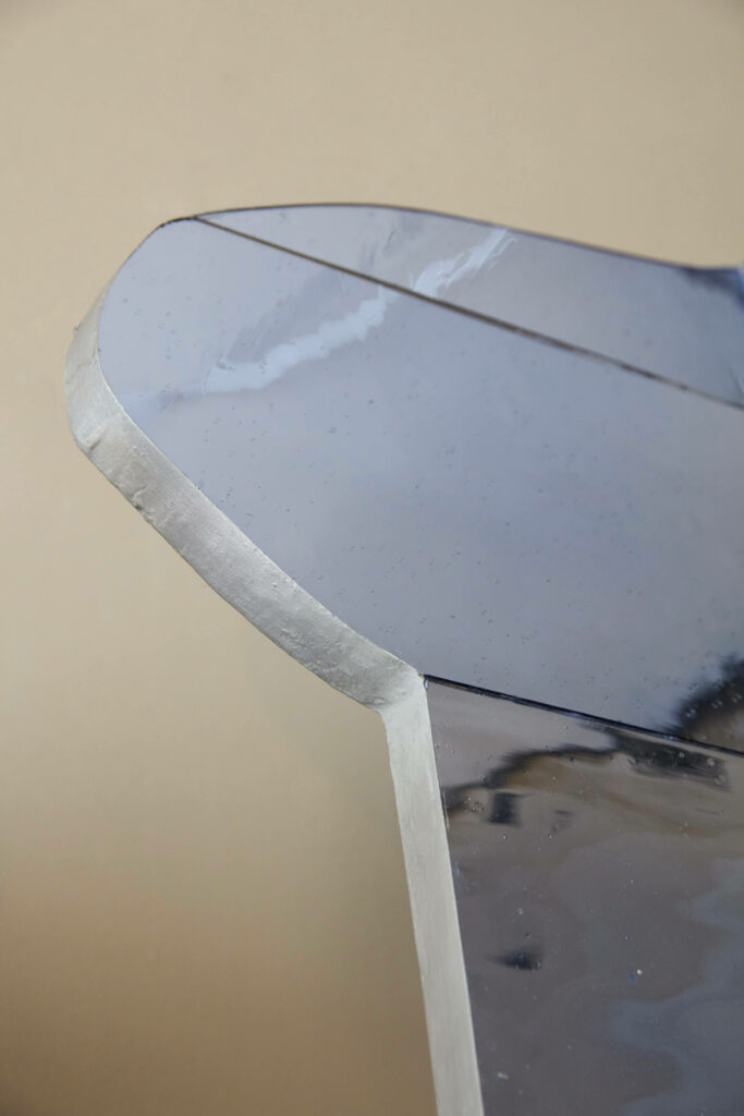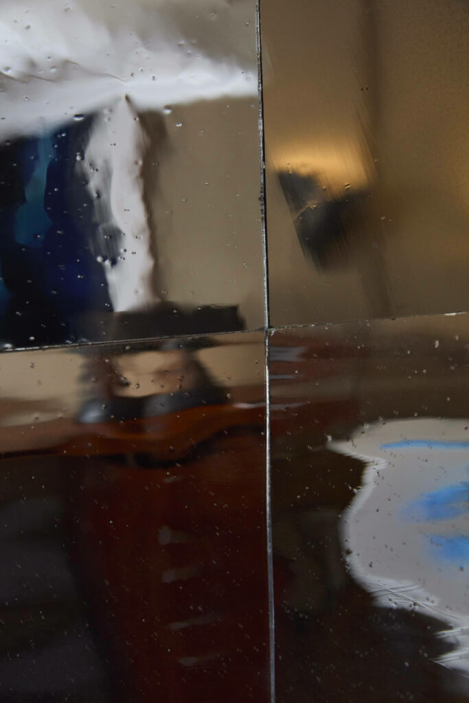 A mirror made up of several blue glasses, stretched or mouth-blown. Wooden back, edges finished with tin powder.