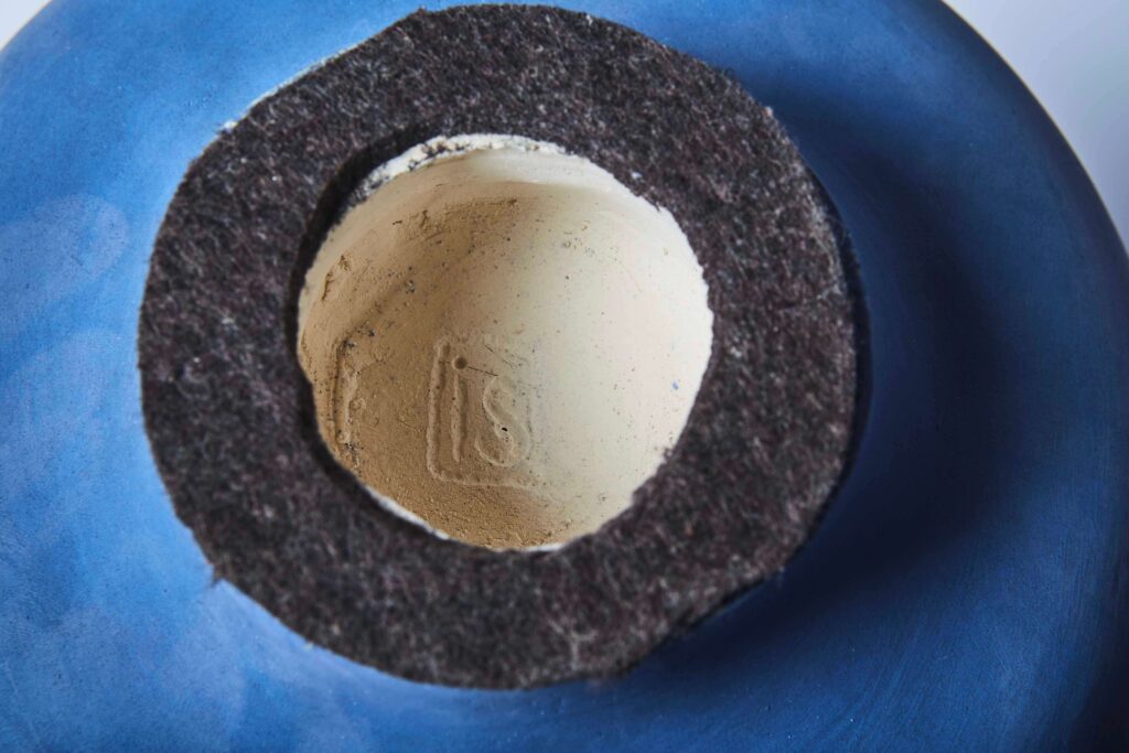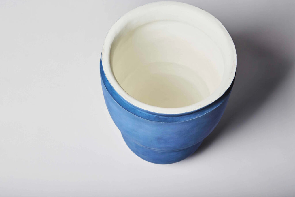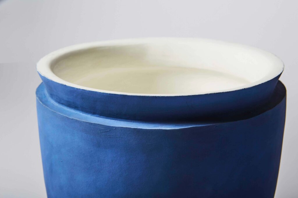 Pebble-polished earthenware pots, covered with a blue engobe.