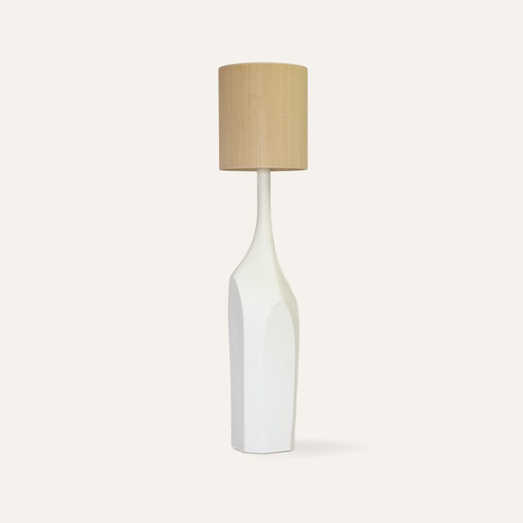 A floor lamp entitled “Edge”, base in plaster, one-of-a-kind shade in woven Sycamore and copper thread.