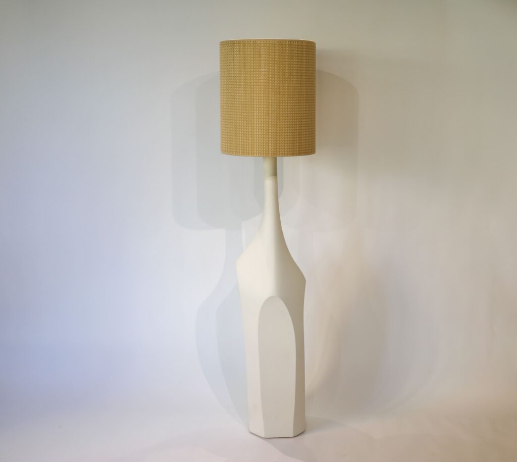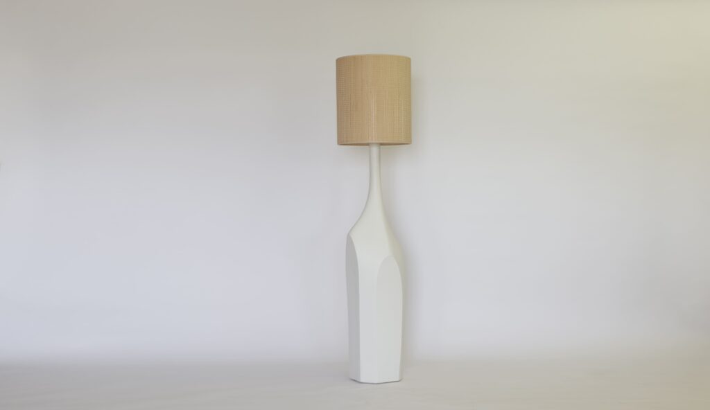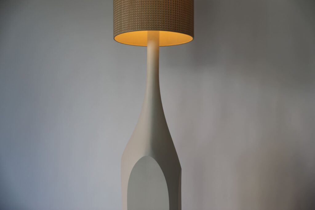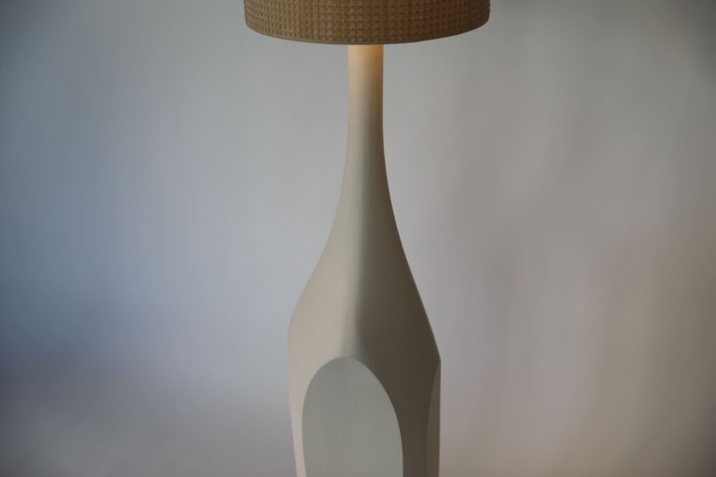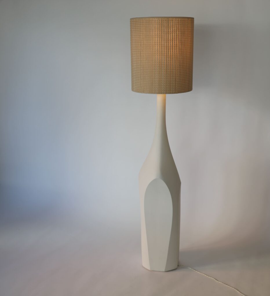 A floor lamp entitled “Edge”, base in plaster, one-of-a-kind shade in woven Sycamore and copper thread.