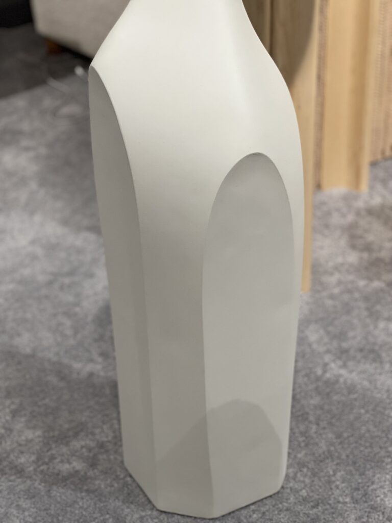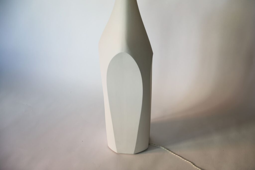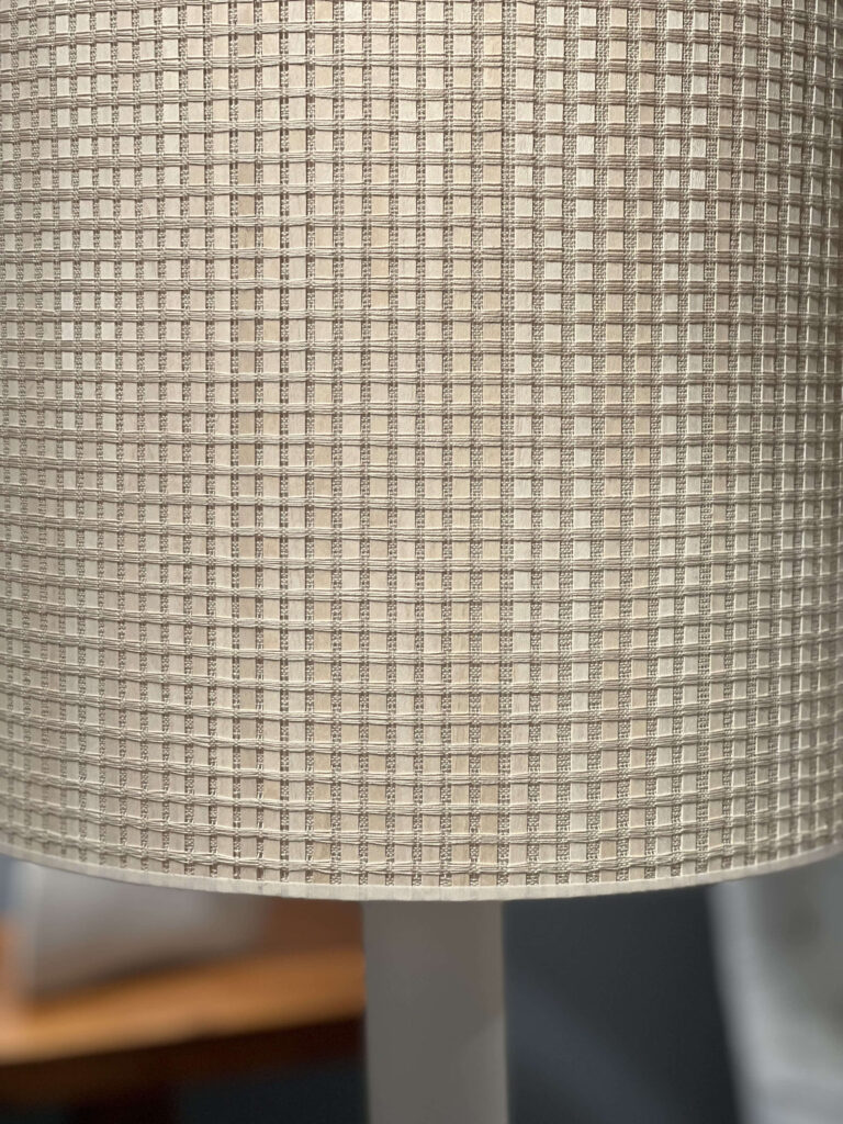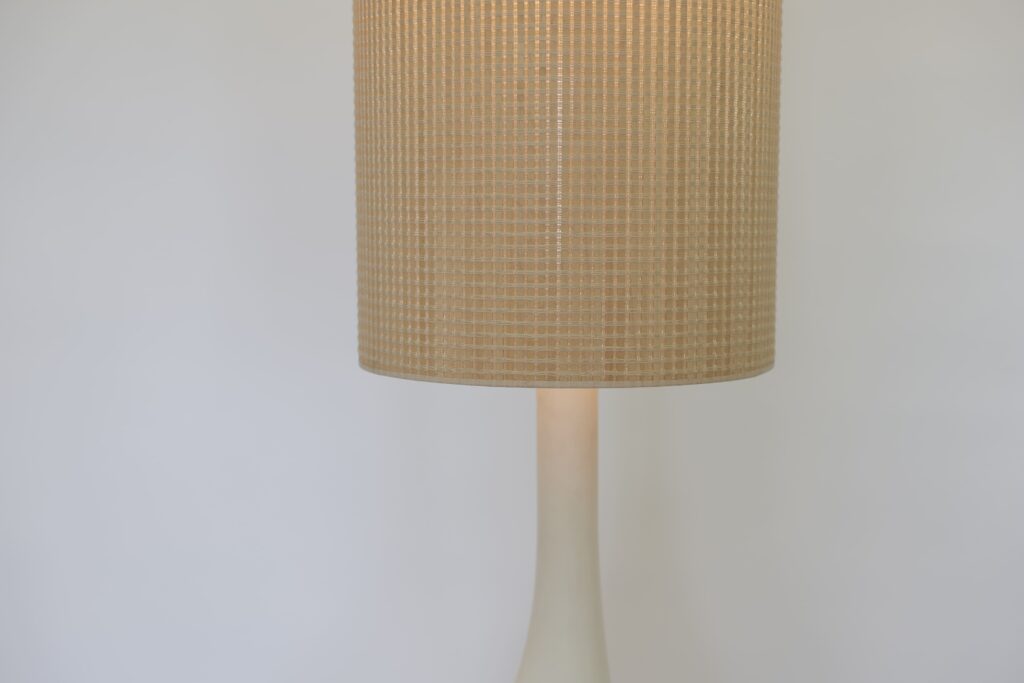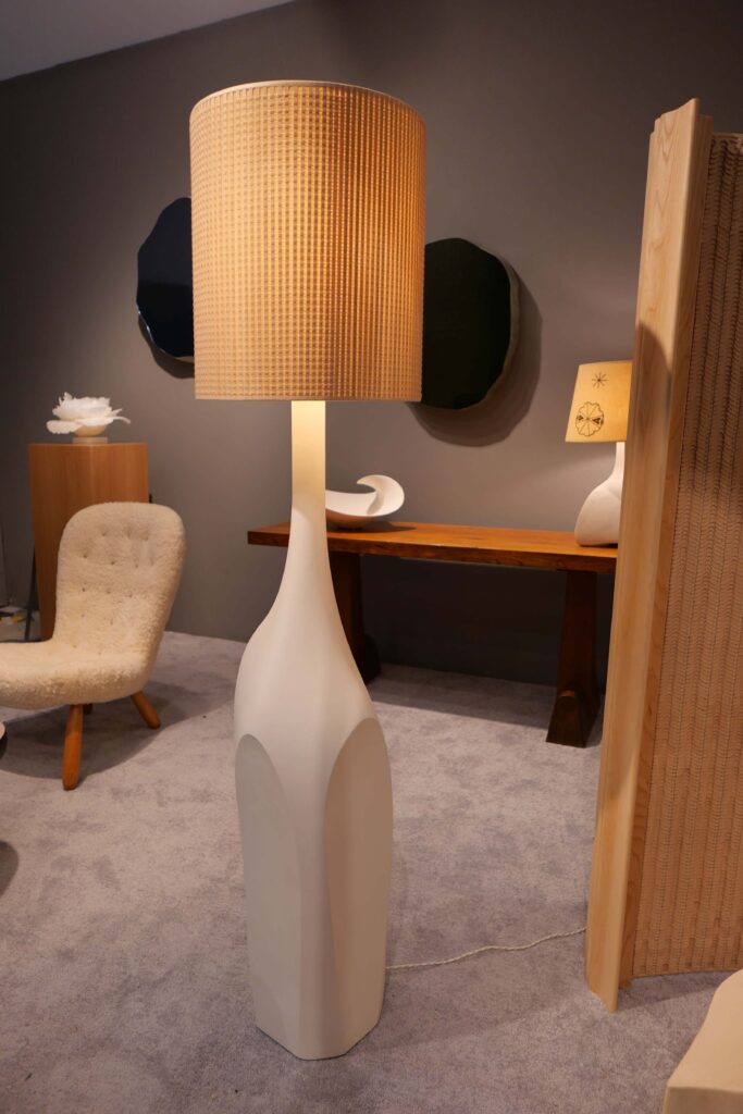 A floor lamp entitled “Edge”, base in plaster, one-of-a-kind shade in woven Sycamore and copper thread.