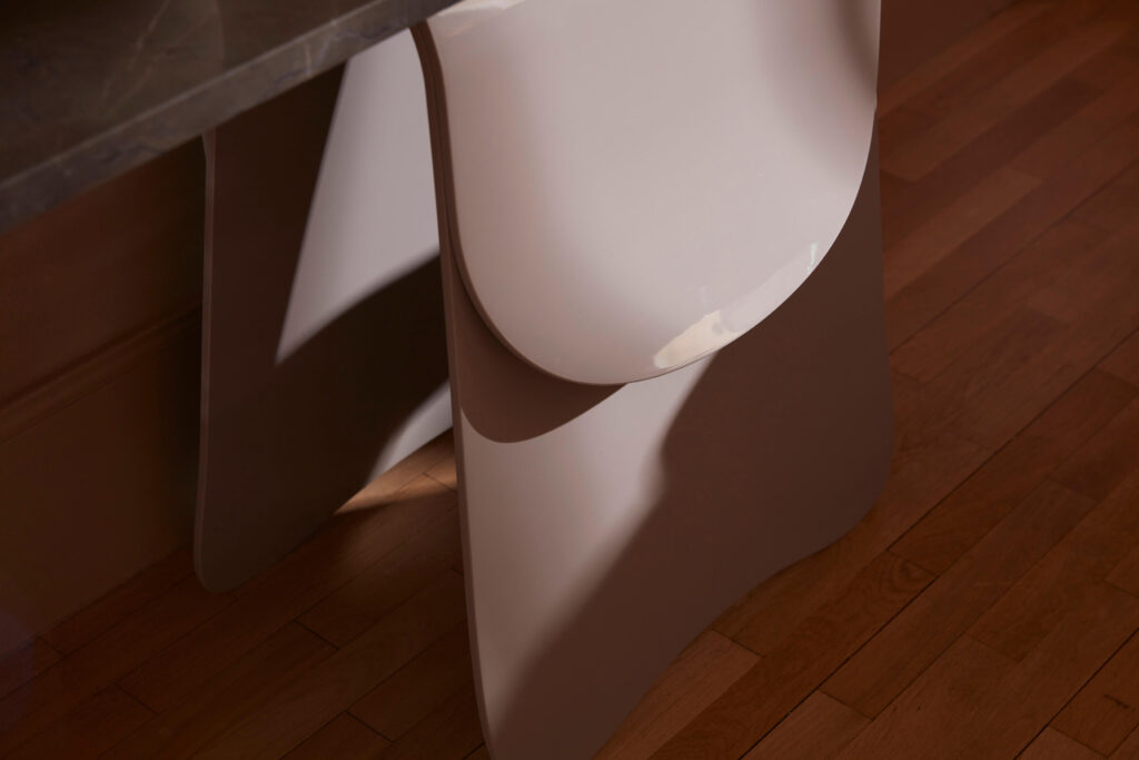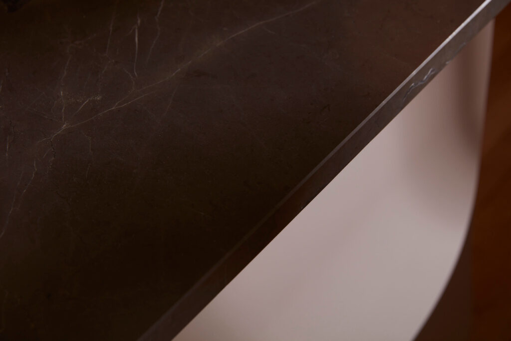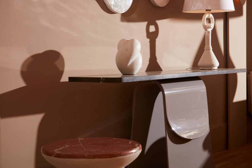 His works explore the language of materials, mixing brass with stone, wood or glass. He collaborates with craftsmen to polish and soften the alabaster or marble and carve out a roundness, almost an emotion. Bronze and aluminium are often the structure of his pieces, they are casted to obtain fluid forms, their curves shape contemporary, elegant and refined pieces.