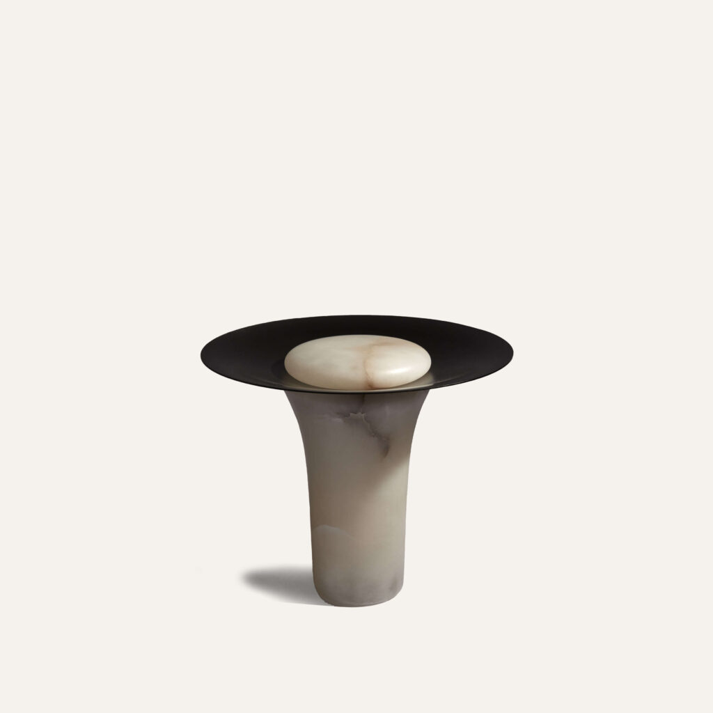 His works explore the language of materials, mixing brass with stone, wood or glass. He collaborates with craftsmen to polish and soften the alabaster or marble and carve out a roundness, almost an emotion. Bronze and aluminium are often the structure of his pieces, they are casted to obtain fluid forms, their curves shape contemporary, elegant and refined pieces.