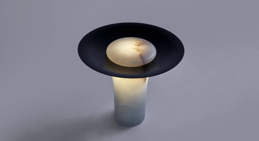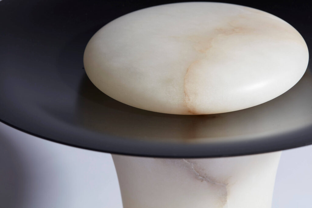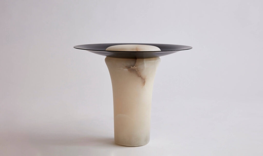 His works explore the language of materials, mixing brass with stone, wood or glass. He collaborates with craftsmen to polish and soften the alabaster or marble and carve out a roundness, almost an emotion. Bronze and aluminium are often the structure of his pieces, they are casted to obtain fluid forms, their curves shape contemporary, elegant and refined pieces.