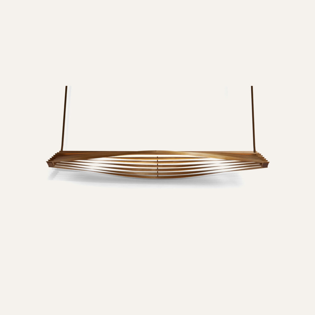 A hanging light entitled “Nasse”, variation #1. Brushed brass, patinated and varnished. LED.
