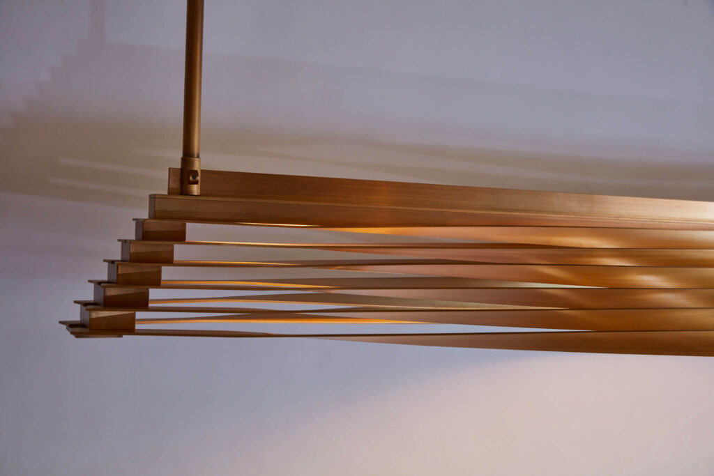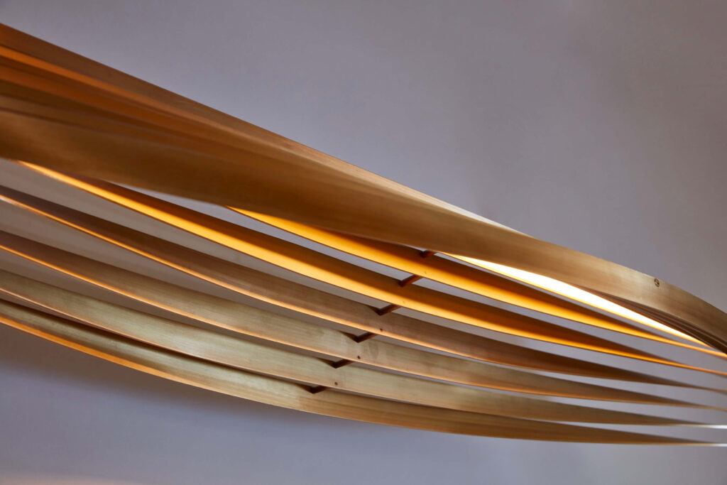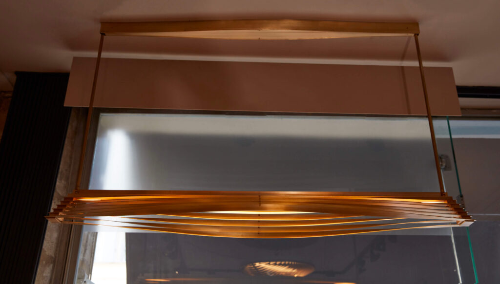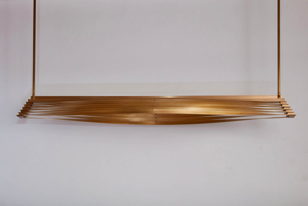 A hanging light entitled “Nasse”, variation #1. Brushed brass, patinated and varnished. LED.