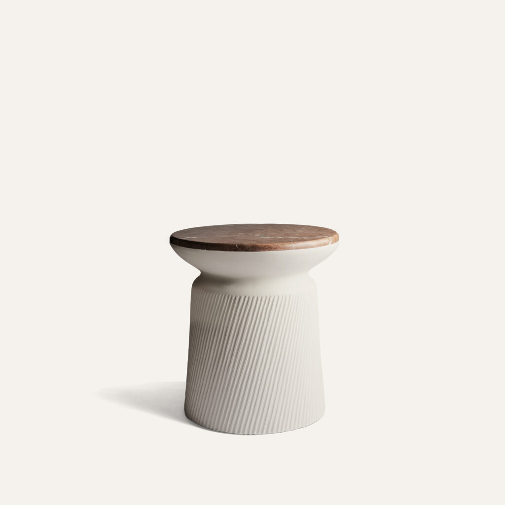 A side table entitled “Rhodes”, sculpted stoneware base and red Alicante marble top.