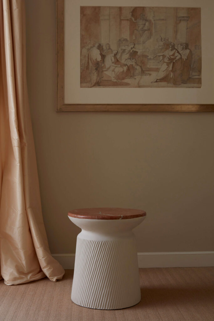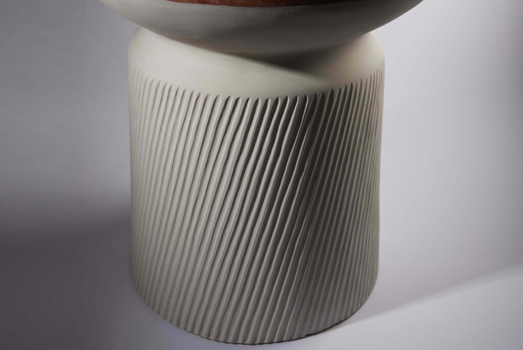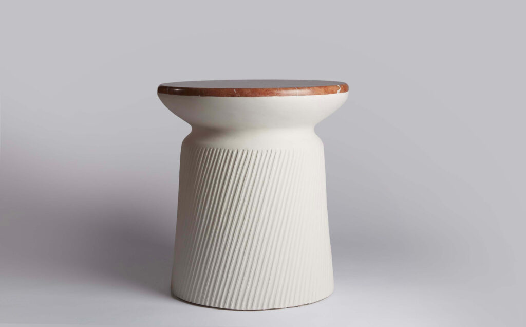 A side table entitled “Rhodes”, sculpted stoneware base and red Alicante marble top.