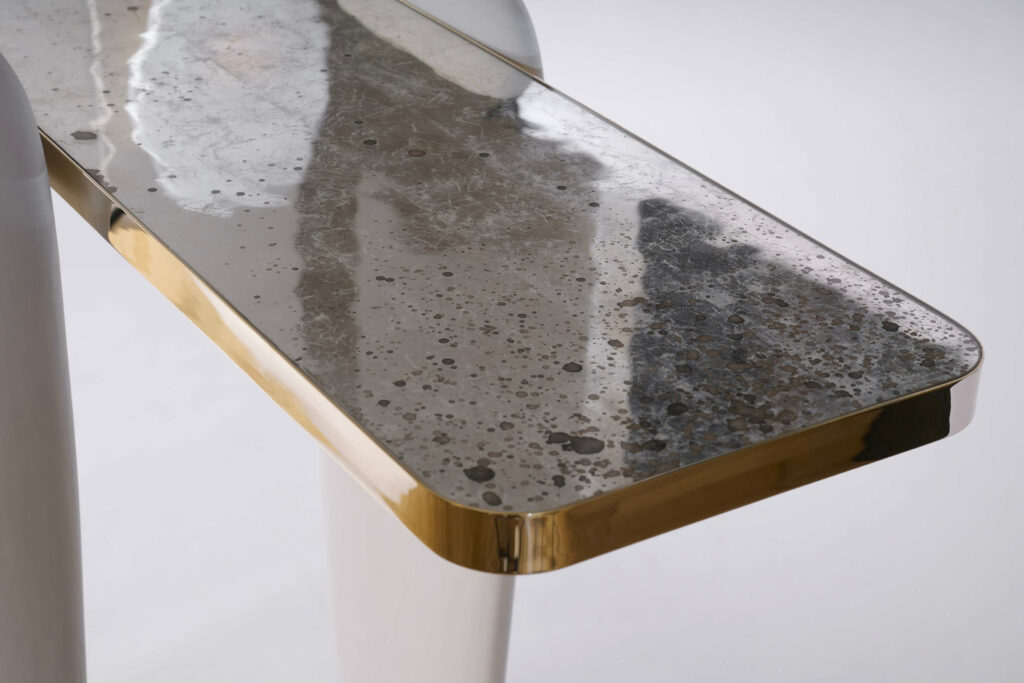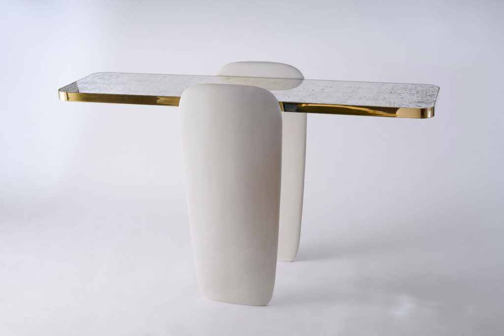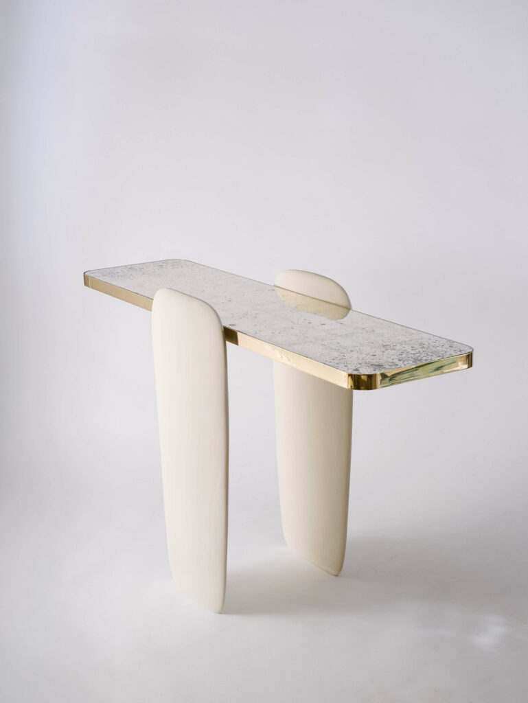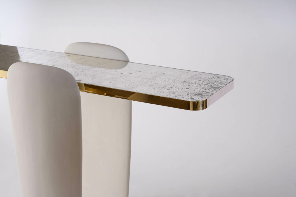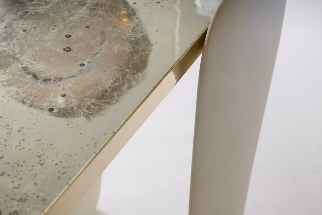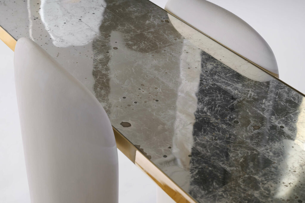 His works explore the language of materials, mixing brass with stone, wood or glass. He collaborates with craftsmen to polish and soften the alabaster or marble and carve out a roundness, almost an emotion. Bronze and aluminium are often the structure of his pieces, they are casted to obtain fluid forms, their curves shape contemporary, elegant and refined pieces.