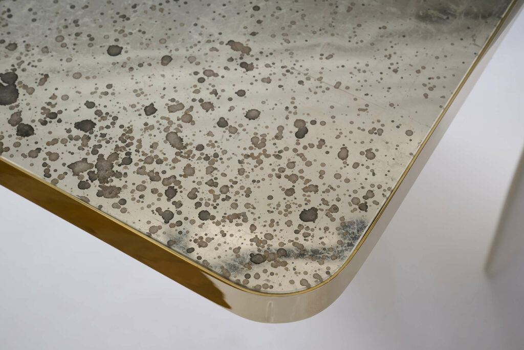 A CONSOLE, WHITE PAINTED PLASTER LEGS, REVERSE PAINTED GLASS TOP DECORATED WITH WHITE GOLD LEAF AND OXIDATION, BRASS EDGES.