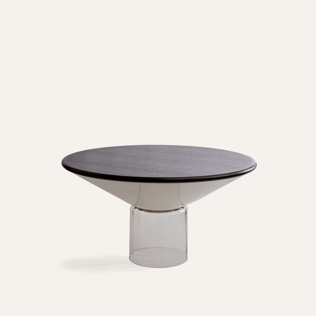 Center table entitled “Spin.” Lacquered and stained wood top, blown glass base.