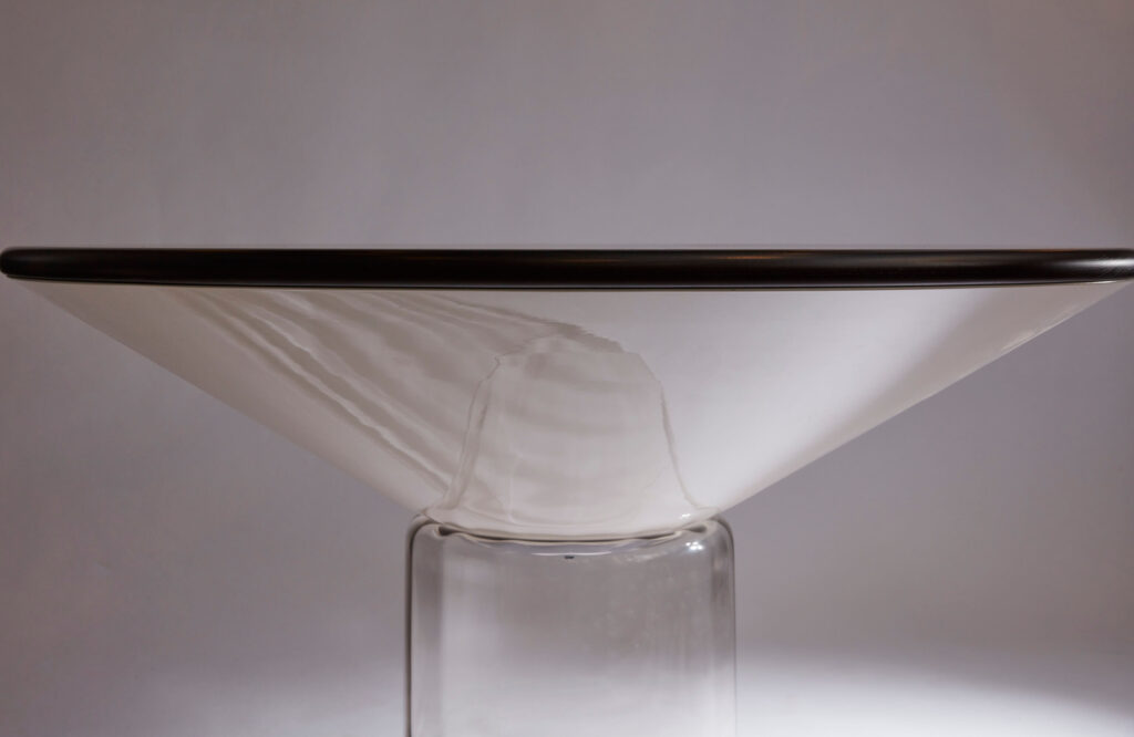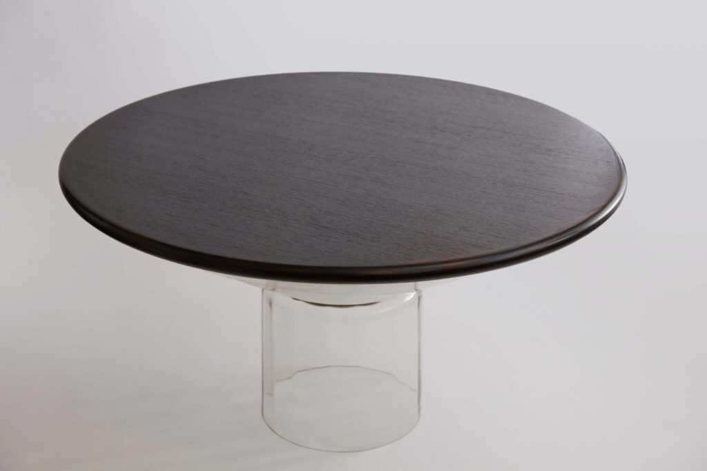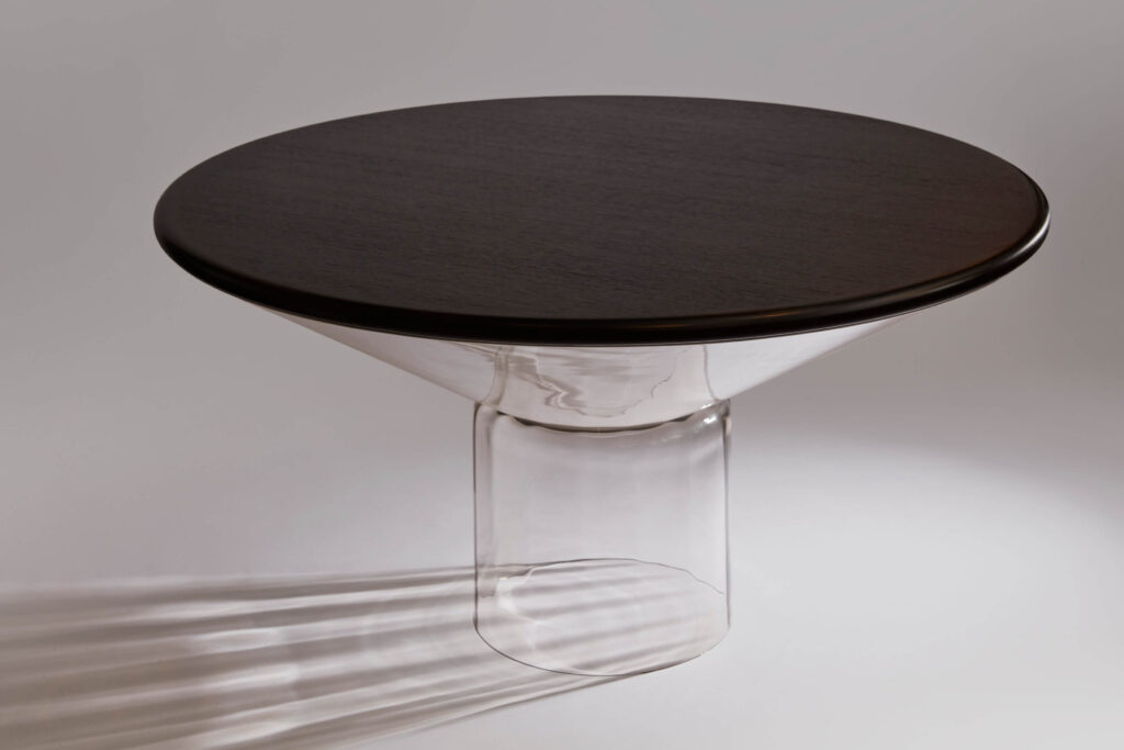 Center table entitled “Spin.” Lacquered and stained wood top, blown glass base.