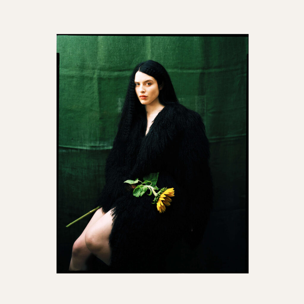 A woman with a double personality – Mady & Monette – posing the enigma of playful genetic, a bold, animal, panther skin, Black and white imparting the expectation of a future dream. … A Sun flower with a hesitant expression, a woman is multi-faceted and beautiful, primitive and universal, captured by the artist’s lens.