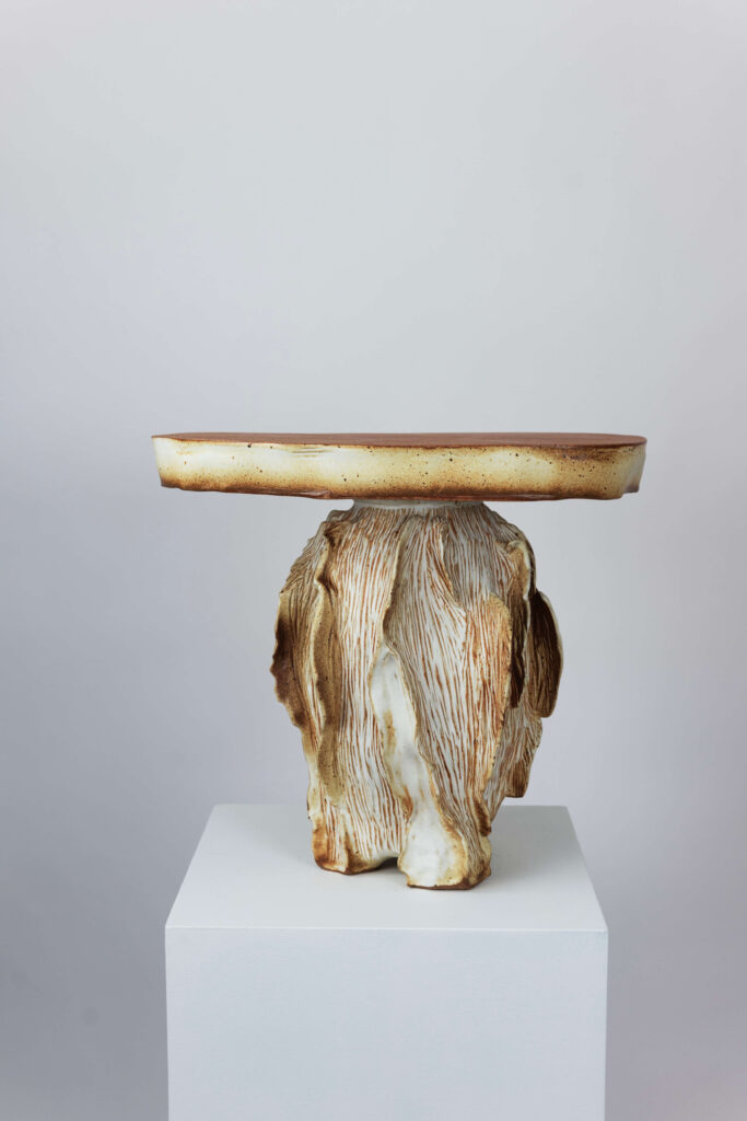 « Ugu » side table in terracotta and cream glazed stoneware. Composed of two pieces, the textured and organic base supports a free-form top.