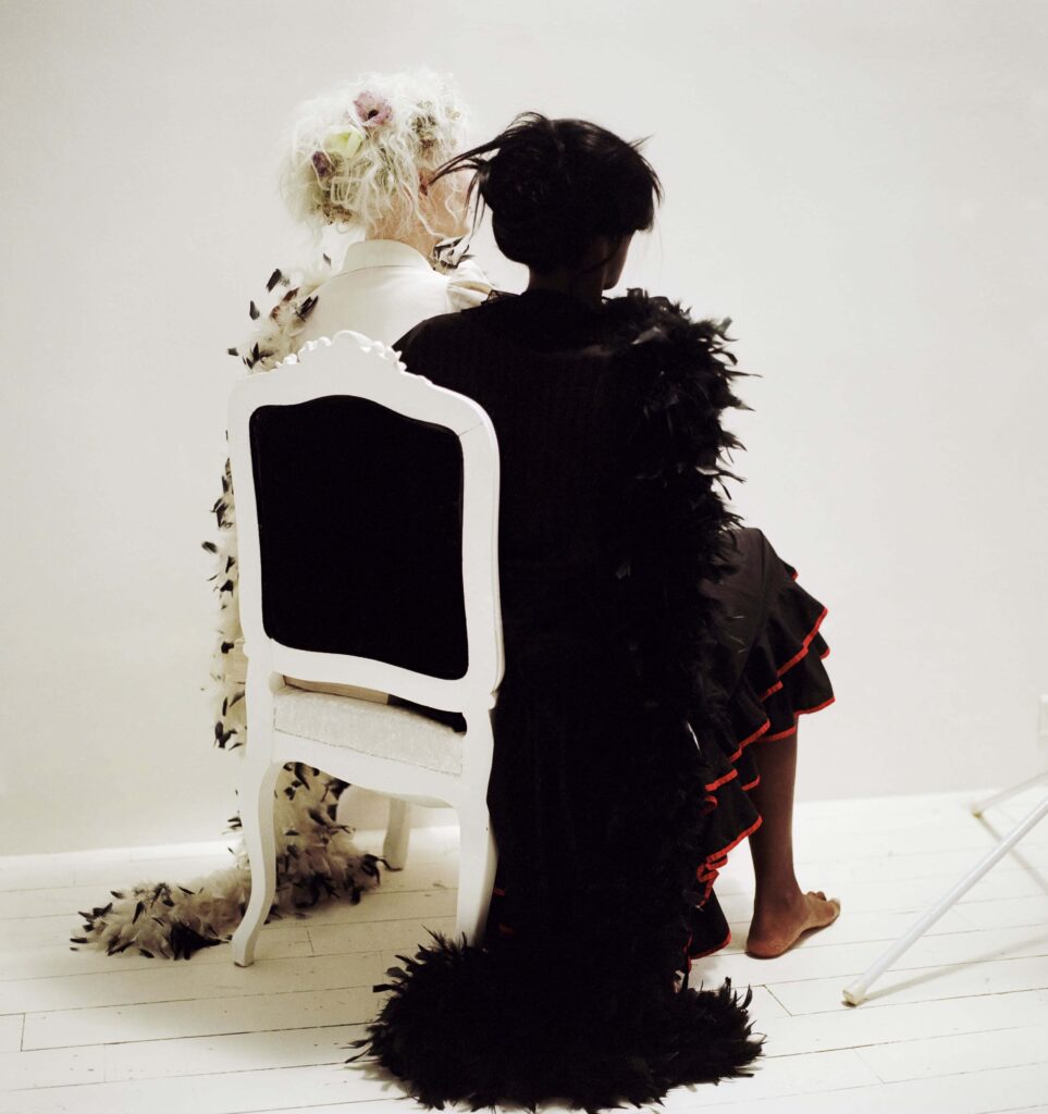 A woman with a double personality – Mady & Monette – posing the enigma of playful genetic, a bold, animal, panther skin, Black and white imparting the expectation of a future dream. … A Sun flower with a hesitant expression, a woman is multi-faceted and beautiful, primitive and universal, captured by the artist’s lens.