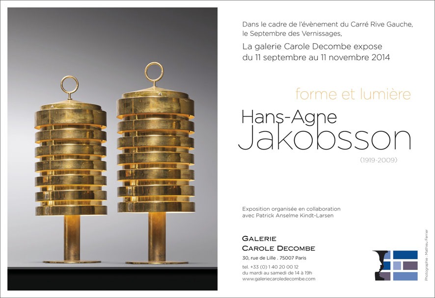 La création de luminaires joue un rôle central en Scandinavie. Non seulement elle pallie manque de lumière naturelle pendant les longs mois dʼhiver mais elle crée du lien social et ceci depuis de nombreuses années. Parmi les designers scandinaves devenus maîtres en la matière, la Galerie Carole Decombe a choisi de montrer les créations de Hans-Agne Jakobsson (1919-2009), moins connu à lʼinternational que dans sa Suède natale malgré la qualité et lʼoriginalité de son travail. Lʼexposition « Forme et lumière », organisée en collaboration avec Patrick Anselme Kindt-Larsen, présente une sélection originale et éclectique, chaque pièce plus étonnante lʼune que lʼautre. Lustres, appliques, lampadaires et lampes confirmeront lʼinventivité et lʼécriture stylistique très personnelle du créateur.