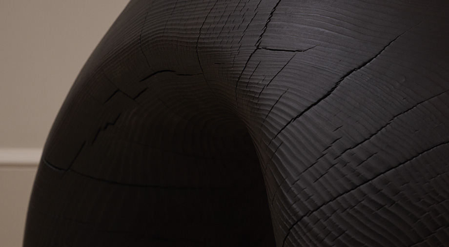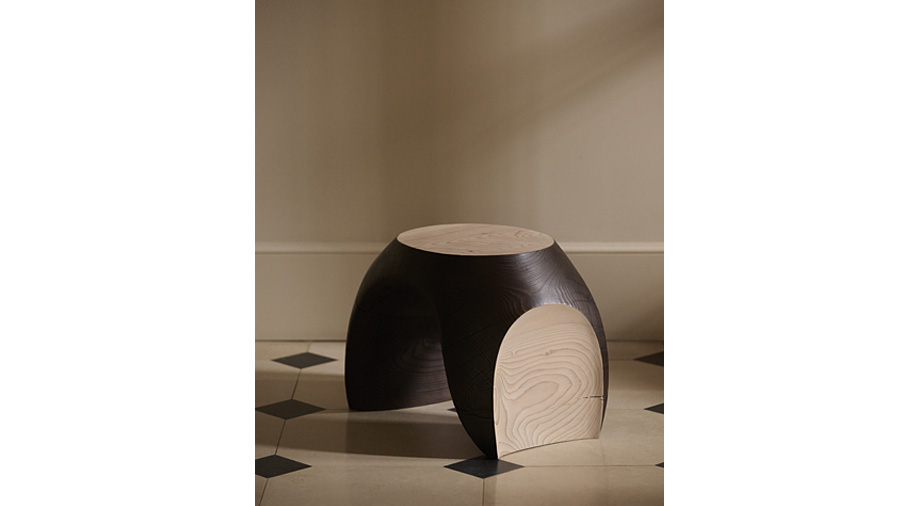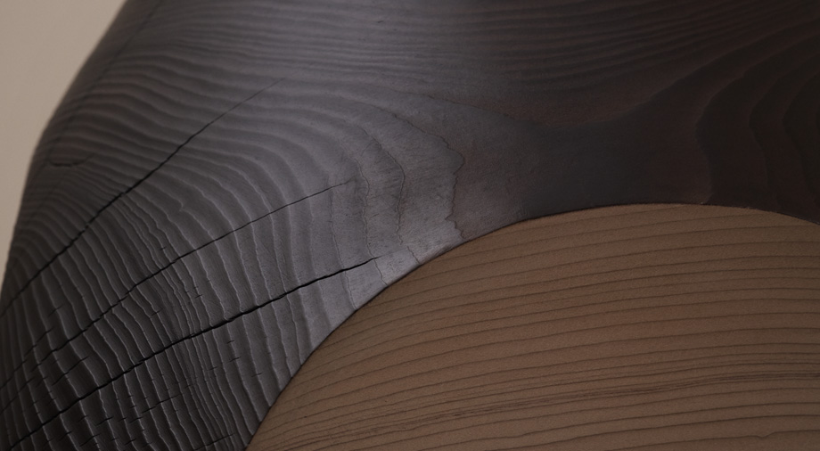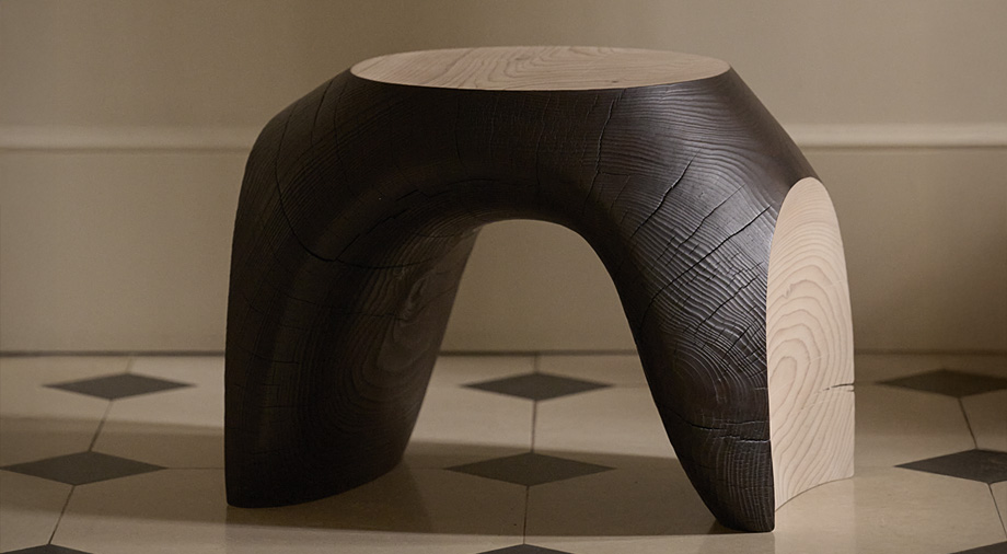 A side table entitled “Kampé.” Burnt cedar. One of a kind.